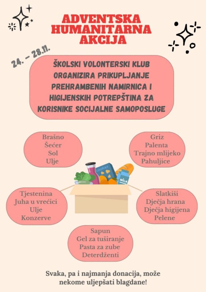 Školski volonterski klub poziva sve učenike, roditelje i zaposlenike da se uključe u adventsku humanitarnu akciju prikupljanja prehrambenih namirnica i higijenskih potrepština za korisnike socijalne samoposluge.
