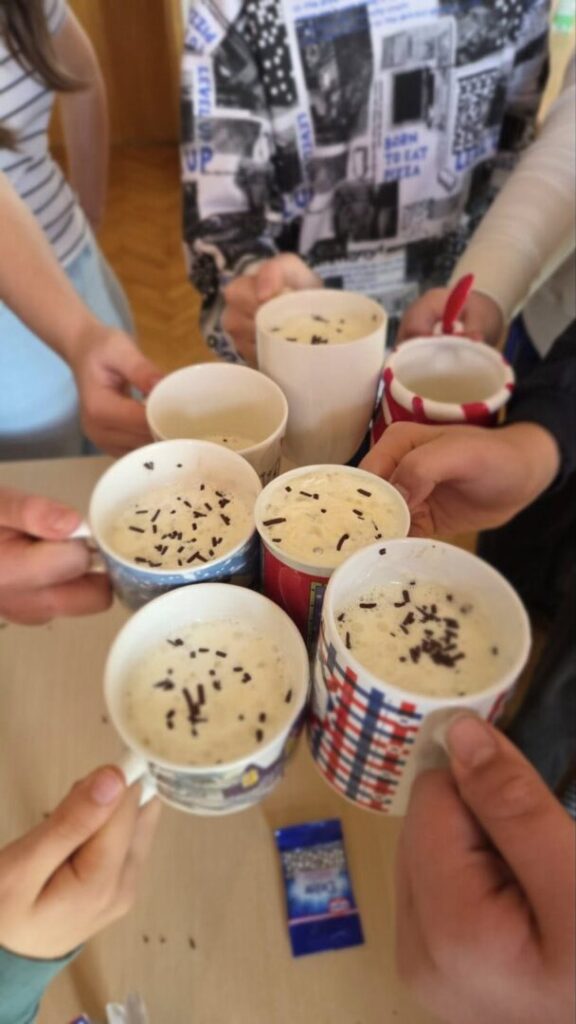 Učenici 6.b razreda proslavili su Dan vruće čokolade uz slatko druženje, puno smijeha i kreativnosti. Svaki učenik pripremio je svoju šalicu, ukrasio je šlagom i čokoladnim mrvicama, a zatim su nazdravili toplim zimskim gutljajem.