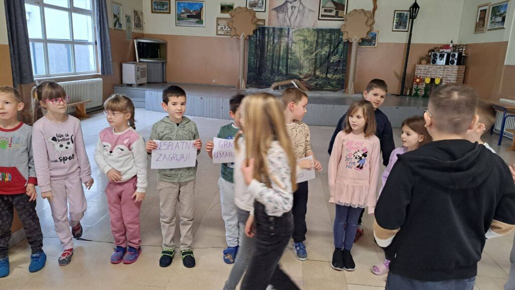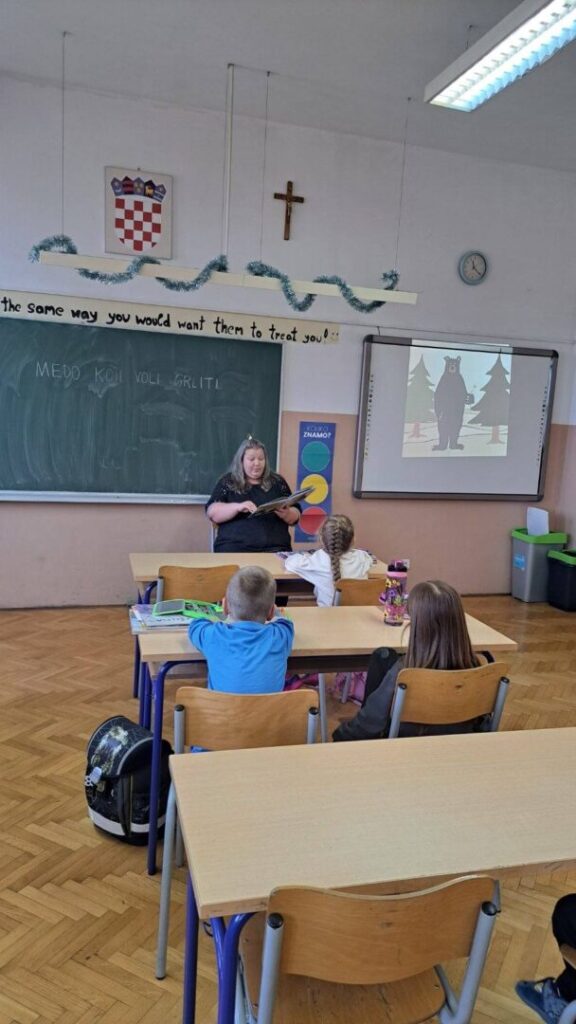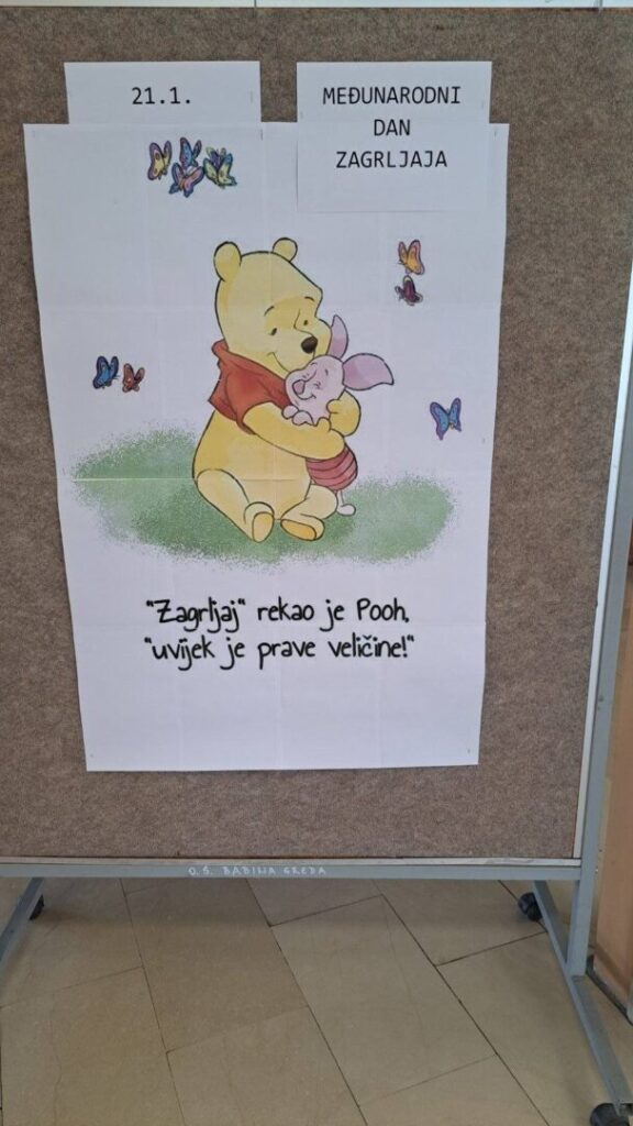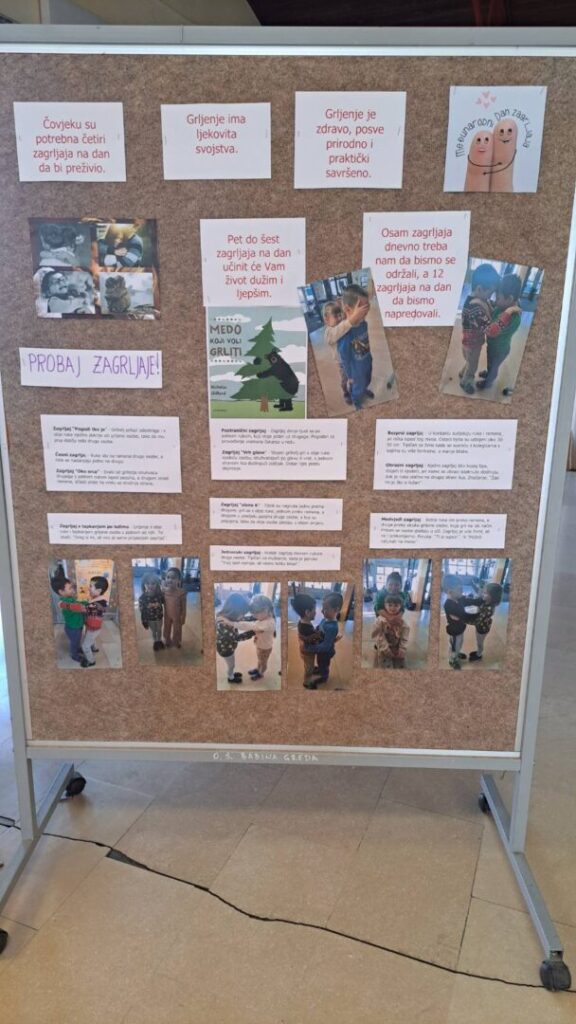 Obilježavanje smo započeli čitanjem knjige N. Oldlanda „Medo koji voli grliti“. Knjigu nam je pročitala Maksimilianova mama. Iz nje smo naučili da medo voli grliti sva živa bića ovog svijeta, ali i kako trebamo kontrolirati svoje emocije i ponašanje u najgorim trenucima pa čak i tada se koristiti zagrljajem. Upoznali smo se sa različitim vrstama zagrljaja koje zapravo stalno koristimo i zapamtili da nam je 5 zagrljaja dovoljno da si produžimo život. Bilo je tu još puno aktivnosti, ali je bila bitna spontana akcija grljenja. Obišli smo našu školu, obližnje trgovine, prolaznike i upoznali ih s Danom grljenja.