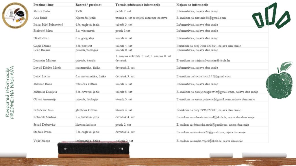 Sukladno Protokolu i mjerama postupanja zbog sigurnosti učenika i nesmetanog odvijanja nastave, roditelji i stranke ulaze u Školu u dogovorenom terminu sastanka ili uz pravovremenu najavu i evidentiranje u knjizi Evidencija