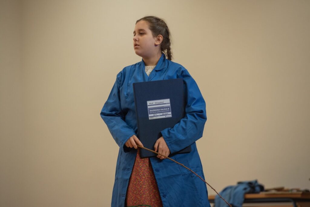 Prvo razdoblje prikazalo je vremena u kojima su djeca dolazila bosa, s kruhom, mašću i pekmezom u torbi, uz stroge učiteljice i šibu, ali i beskrajnu želju za znanjem. Drugo razdoblje vratilo je publiku u doba kuta, gume, klikera, prvih odlazaka u kino i školske svakodnevice puna igre, viceva i dječje neposrednosti.